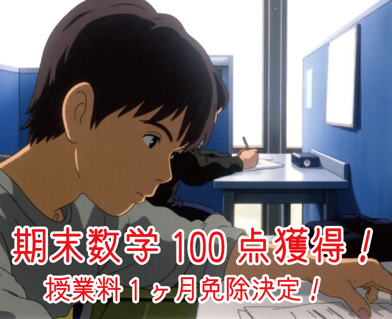 ・中1:T君…数学100点(1ヶ月授業料免除)、社会95点、英語91点